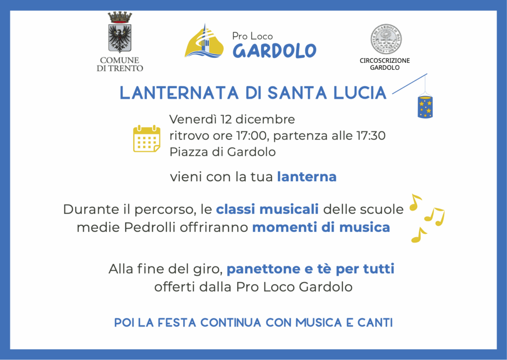 Tra gli appuntamenti più attesi, la Pro Loco di Gardolo organizza per venerdì 12 dicembre ore 17.00 la tradizionale Lanternata di Santa Lucia: una passeggiata per le vie del quartiere insieme ai bambini e alle loro lanterne, in un’atmosfera luminosa e festosa, in attesa dell’arrivo di Santa Lucia.