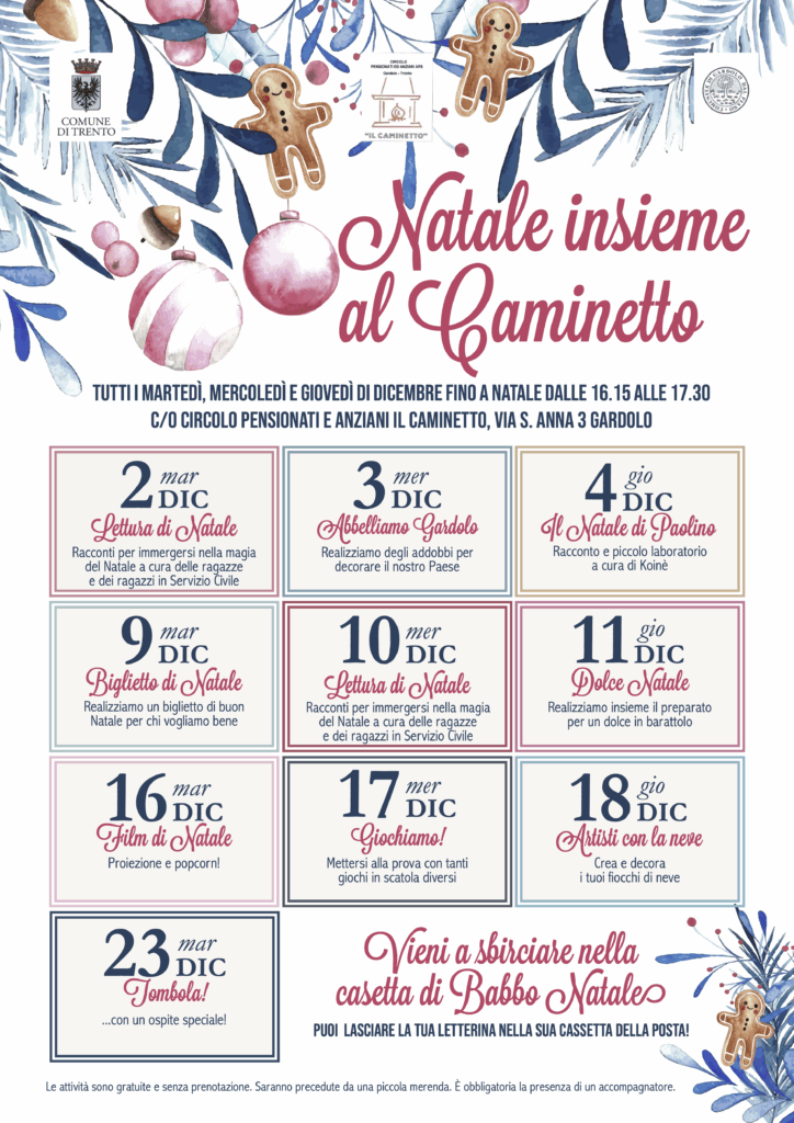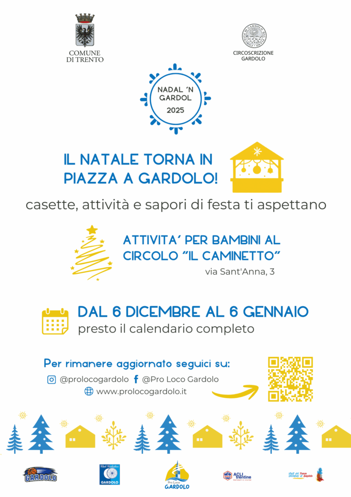 Anche quest’anno la piazza di Gardolo si anima con le casette di Nadal ’n Gardol, uno spazio accogliente dove le associazioni del territorio proporranno buon cibo, momenti conviviali e attività per tutte le età. Le casette saranno attive durante la settimana e nei weekend, affiancate a rotazione da hobbisti e altre realtà locali che offriranno piccole vendite artigianali, laboratori e proposte dedicate al periodo natalizio.